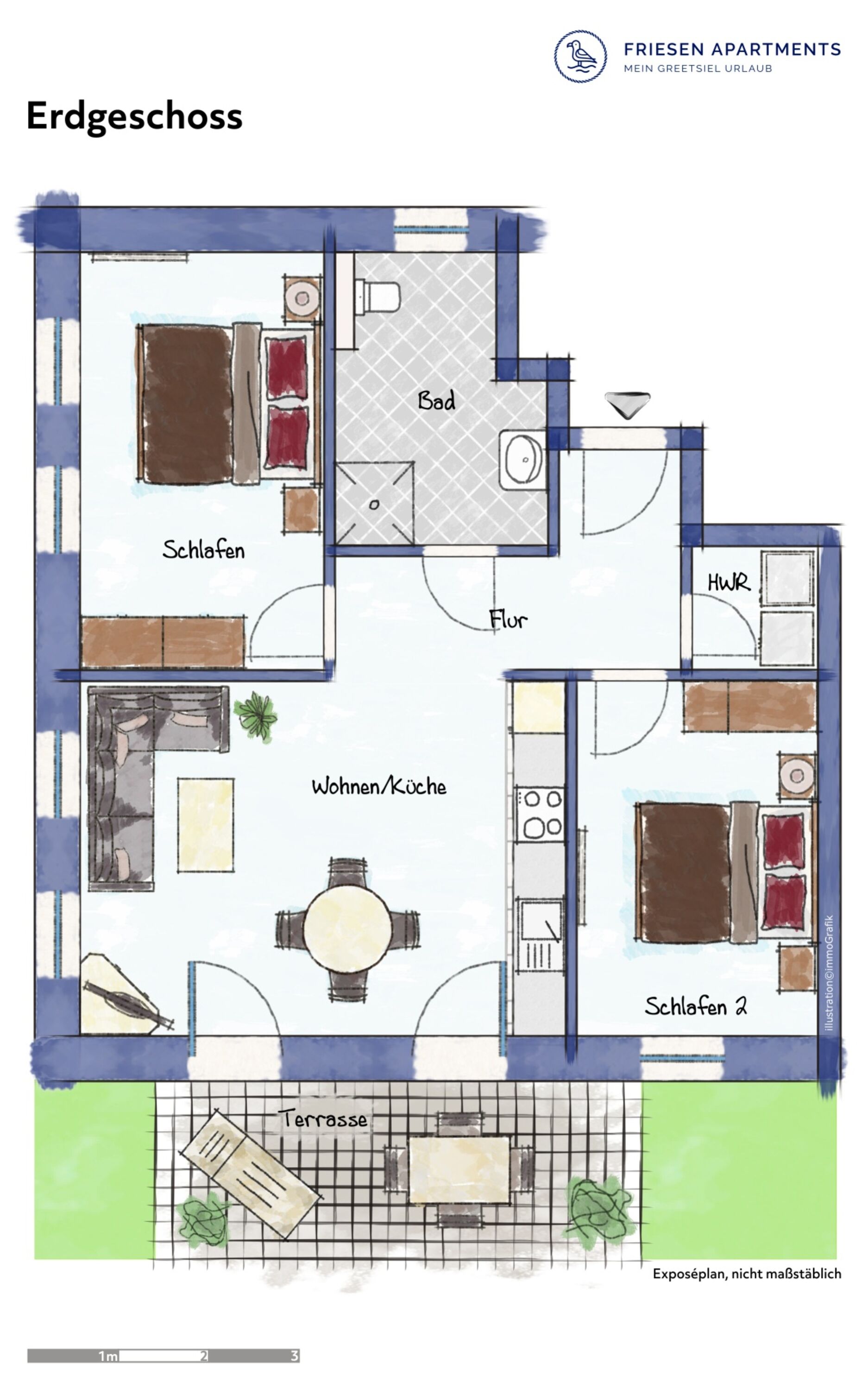 Mit der Ferienwohnung "Mauritz" erwartet Sie in Greetsiel ein exklusives Feriendomizil, das stilvolle Eleganz, luxuriösen Komfort und eine außergewöhnlich hochwertige Ausstattung auf harmonische Weise vereint. Die im Erdgeschoss gelegene Wohnung bietet auf 70qm ein großzügiges Raumgefühl und ein Ambiente, das vom ersten Moment an begeistert. Der lichtdurchflutete Wohn- und Essbereich bildet das Herzstück der Wohnung. Große Fenster sorgen für eine helle, freundliche Atmosphäre, das hochwertige Sofa lädt zu entspannten Abenden ein und der elegante Essbereich ist der perfekte Ort für gesellige Stunden. Die voll ausgestattete Küche überzeugt mit durchdachter Ausstattung und edlen Materialien. Direkt vom Wohnbereich aus betreten Sie die Terrasse und den angrenzenden Garten, den besonders Kinder oder Vierbeiner schätzen werden. Ob ein Frühstück in der Morgensonne oder ein entspannter Ausklang des Tages an der frischen Nordseeluft – dieser Außenbereich erweitert den Wohnraum auf angenehme Weise. Die beiden stilvollen Schlafzimmer bieten hochwertige Boxspringbetten sowie große Ablageflächen und TV's. Auch das moderne Tageslichtbad unterstreicht den gehobenen Charakter der Wohnung: Eine großzügige, ebenerdige Dusche, hochwertige Armaturen und eine geschmackvolle Gestaltung schaffen ein Ambiente, das an ein Boutique-Hotel erinnert. Im Außenbereich finden Sie einen reservierten Parkplatz mit Lademöglichkeit für E-Fahrzeuge sowie einen Abstellraum für Fahrräder. Die Ferienwohnung "Mauritz" besticht insgesamt durch ihre luxuriöse, bis ins Detail durchdachte Ausstattung und eine außergewöhnlich geschmackvolle Einrichtung. Hochwertige Materialien, harmonische Farbkonzepte und liebevolle Dekorationselemente verleihen der Wohnung eine besondere Exklusivität – ein Ort, an dem stilvolles Wohnen und entspannte Urlaubstage perfekt miteinander verschmelzen.